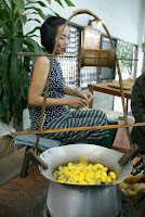 Place aux artisans (en fait plutôt à de belles PME !). Après avoir découvert comment on fabrique et pose la laque puis les décors en or sur les pots, vases, assiettes, etc..., (d'où nous sortons avec plusieurs jolies choses pour les amis, la famille, et nous) nous allons chez un important marchand de bijoux, d'où Françoise sortira avec une très belle bague en saphir jaune (mais là, c'est cadeau !). Puis, nous visitons un atelier de tissage de la soie (d'où Françoise sortira avec un très joli centre de table en soie), puis un atelier de celadon (porcelaine vert pâle, d'où Françoise ... non, elle a été raisonnable !). Notez que nous sommes dimanche : tout est ouvert, et beaucoup d'ouvriers travaillent "en HS".